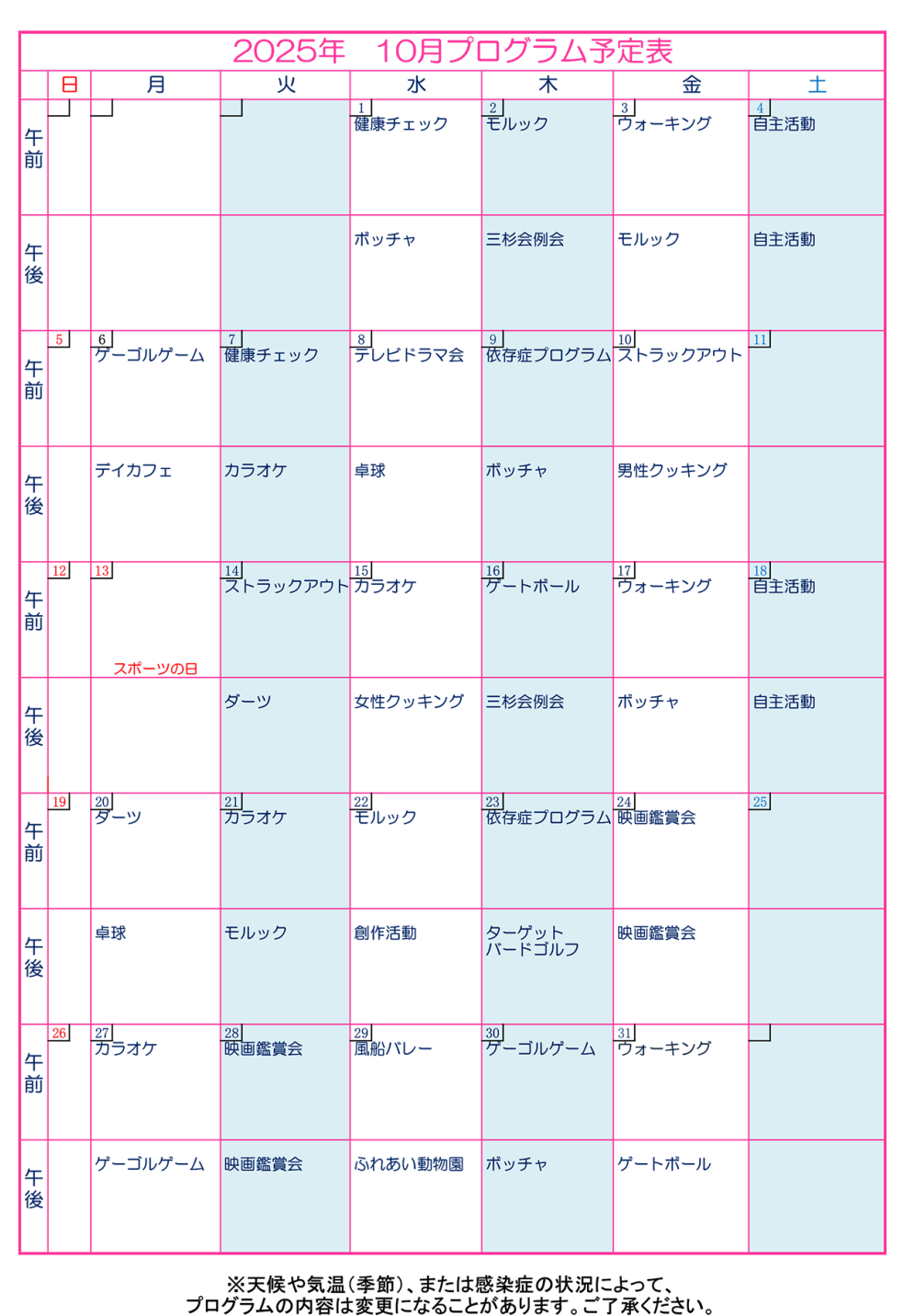 外来通院の方を対象としたリハビリテーションの場です。 グループ活動やレクリエーションを通し、社会復帰や病状 の安定を目指します。病気や障がいとうまく付き合う方法や 生活のしづらさを軽減できるよう、ひとりひとりの目標を 実現できるようにお手伝いさせていただきます。