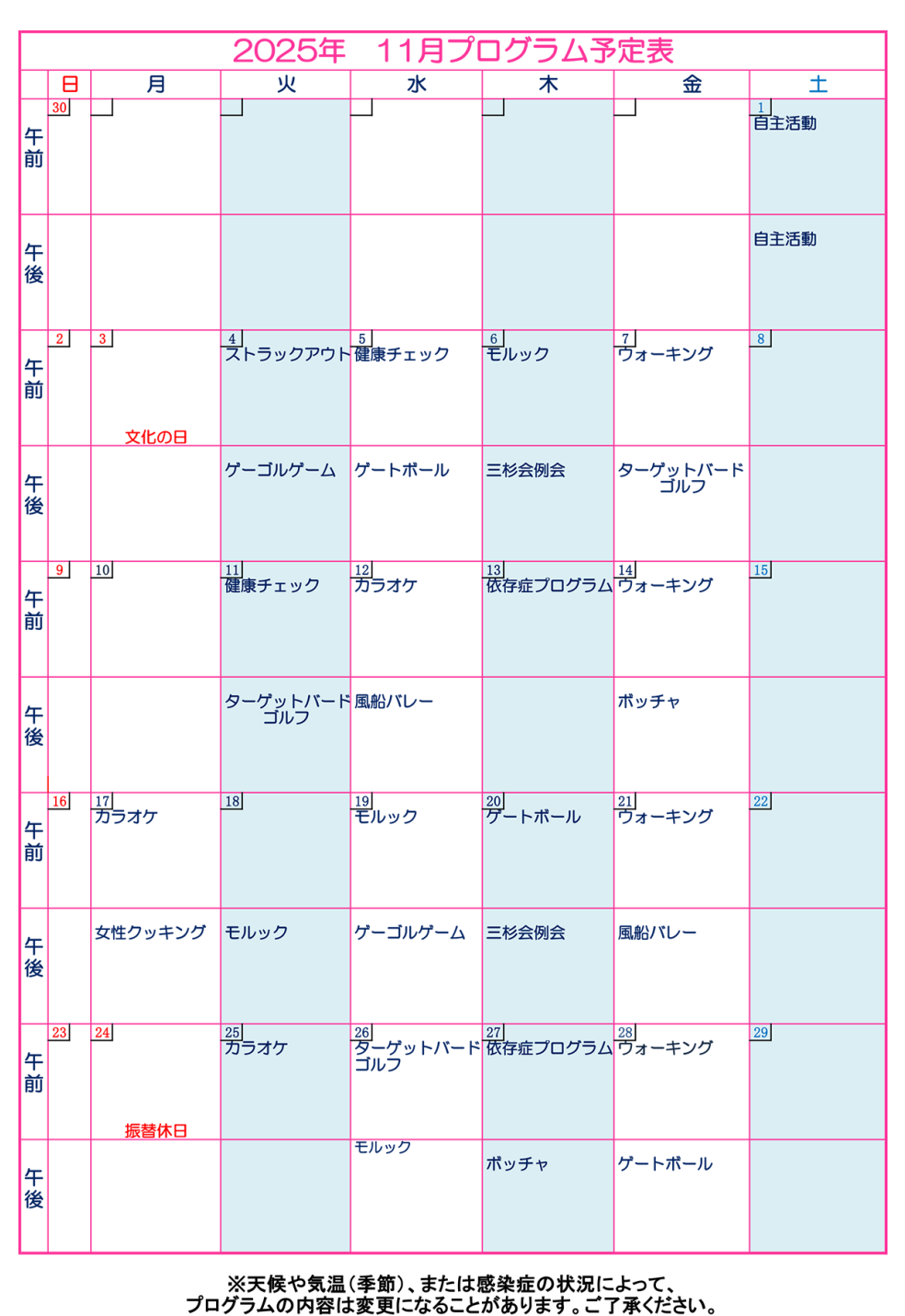 - 昼食を含め、各種健康保険、自立支援医療、生活保護が適用されます。